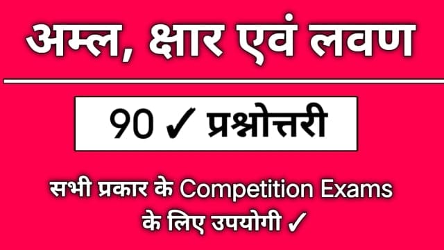 Acids Bases and Salts Questions | अम्ल क्षार एवं लवण से संबंधित सभी महत्वपूर्ण 90 प्रश्नोत्तर आपको इस पोस्ट में मिलेंगे जो प्रतियोगी परीक्षा (Banking, SSC, Railway, UPSC) की दृष्टि से महत्वपूर्ण हैं ! रसायन विज्ञान का यह बहुत ही महत्वपूर्ण टॉपिक है एक बार इन सभी प्रश्नोत्तर को अवश्य देखें !